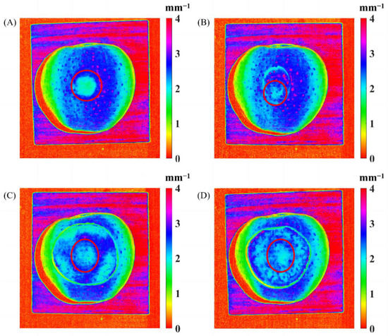 Figure 11 shows the reduced scattering coefficient mappings of the bruised apple covered with pre-prepared apple slices, with the bruised tissue marked in red circles. It was noticed that the bruised apple tissue without being covered by any slice, as shown in Figure 11A, was clearly observed from the reduced scattering coefficient mapping. Figure 11B shows that the bruised apple tissue covered with the 1.2 mm thick slice with peel could still be easily recognized, revealing that the spatially modulated light could completely penetrate through the apple slices with peel with the thickness of 0–1.2 mm. The 1.5 mm thick slice cover without peel (Figure 11D) provided more difficulty for apple bruise detection than the 0.8 mm thick slice (Figure 11C), but both of them could still be penetrated by the light. Through data analysis of all the mapping results with different-thickness slices, it was concluded that the apple slice without peel could be completely penetrated with the thickness range of 0–1.5 mm.