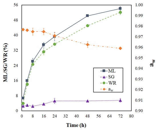The progress of moisture loss (ML), solids gain (SG), weight reduction (WR), and water activity (aw) during the PVOD kinetic of jambolan can be visualized in Figure 1. As can be seen, ML and WR presented a sharp increase in the first 16 h of the process, which represented 64.5% and 60% of the total ML and WR accounted for jambolan, respectively, during its PVOD kinetic. After that period, ML and WR evolution became less intense, until no big changes were observed. The osmotic pressure is the driving force responsible for water diffusion from the food to the solution, which is higher at the beginning of the process and promotes higher ML rates due to the difference between concentrations of the dilute solute (from the fruit) and its surrounding hypertonic solution [25,39,40]. In contrast, SG rates were not prominent at the initial stages of osmotic treatment (first 8 h). However, SG slightly increased in the material after 8 h. Thus, the pressure and concentration gradients gradually decreased as time progressed, until the equilibrium condition was achieved.