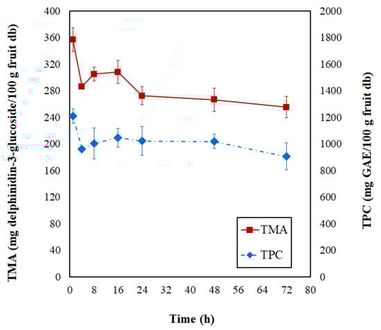 In Figure 3, the total monomeric anthocyanin (TMA) and total phenolic content (TPC) modifications are evidenced during the PVOD kinetic of jambolan. During the first 4 h of the process, the TMA and TPC suffered a significant decrease, and, after this process time, the values remained almost stabilized until it reached the end of the operation (72 h). At the final PVOD time, TMA retained 53.43% and TPC retained 73.11%, concerning the initial contents.