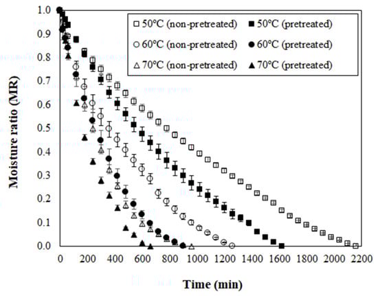 Moisture ratio (MR) versus drying time for non-pretreated and pretreated jambolan fruits submitted to drying at 50, 60, and 70 °C.