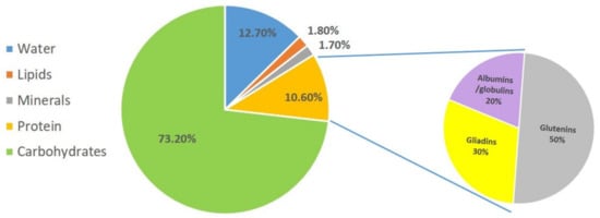 Based on their solubility, wheat proteins are classified into four so-called Osborne fractions: albumins, globulins, gliadins, and glutenins [10]. The albumin/globulin fraction represents 20–25% of wheat proteins, while gliadins and glutenins account for 75–90% of wheat proteins (Figure 1). Gluten is made up of 90% protein, 8% fat, and 2% carbohydrate, and is a complex mixture of hundreds of related but distinct proteins, mainly made up of gliadins and glutenins [11].