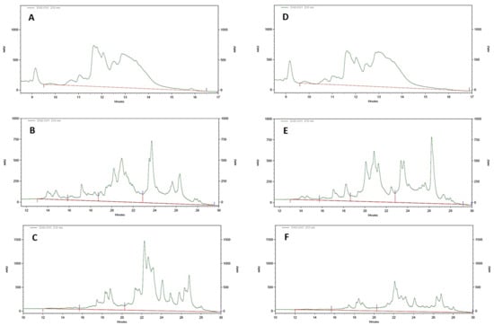 RP-HPLC chromatograms in representative samples of commercial and monovarietal wheat flour. (A) Albumins/globulins—Commercial flour; (B) Gliadins—Commercial flour; (C) Glutenins—Commercial flour; (D) Albumins/globulins—Monovarietal flour; (E) Gliadins—Monovarietal flour (F) Glutenins—Monovarietal flour.