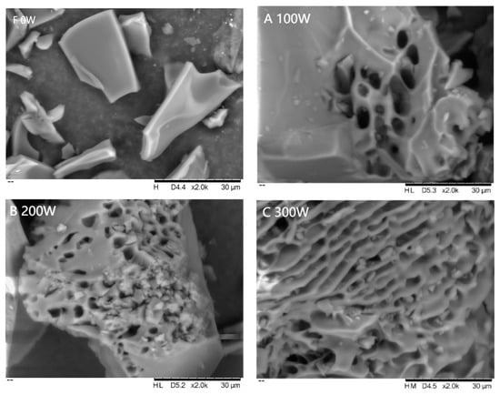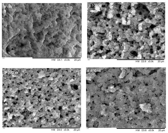 By comparing the micrographs shown in Figure 4A and Figure 5a, we found that the EWP powder structure was relatively regular and dense with fine local pores and a surface full of particles of uneven size (×2000), and the pore and particle distribution was uneven (×5000) under 100 W treatment. As the power increased, the pores became denser, the structure became more uniform, and the surface particles decreased. However, at higher powers (400 W and 500 W), the structure became uneven, with larger pores and more surface particles. This may be due to enhanced protein interactions resulting from the frictional effect of polar molecules at overpowered microwave treatment. However, by examining all ten figures, we observed that at 300 W, the pore structure was more uniform and regular. This is consistent with the finding that the average particle size was the smallest and the absolute value of the zeta potential was the largest at 300 W, indicating a more stable system. The molecular flexibility of protein molecules [32] may be responsible for this phenomenon, as it makes them more likely to unfold and change shape under appropriate microwave irradiation. Overall, suitable microwave irradiation could enhance the cross-linking of protein powder, which contributes to a more stable structure.