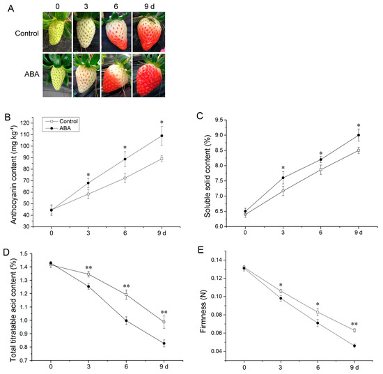 Influence of ABA on strawberry fruit phenotype (A), anthocyanin (B), soluble solid (C), total titratable acid (D), and firmness (E). Error bars represent standard deviation (SD, n = 3). Asterisks indicate values significantly different by Student’s t test from the control samples (* p < 0.05; ** p < 0.01).