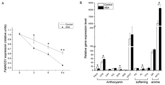 Relative expression levels of FaMADS1 (A) in strawberry fruit at 0, 3, 6, and 9 d after ABA treatment and other ripening-related genes (B) in strawberry fruit at 3 d after ABA treatment. Anthocyanin-related genes: FaANS, anthocyanidin synthase; Fa4CL, ρ-coumarate ligase; FaC4H, cinnamicacid-4-hydroxylase; FaCHS, chalcone synthase; FaDFR, dihydroflavonol 4-reductase; FaPAL6, phenylalanine ammonia lyase; FaUFGT, flavonoid 3-O-glucosyltransferase. Softening-related genes: FaPG, Polygalacturonase; FaPL, pectate lyase; FaXTH, xyloglucan endotransglycosylase/hydrolase. Aroma-related genes: FaAAT2, alcohol acyltransferase; FaQR, quinone oxidoreductase. Error bars represent standard deviation (SD, n = 3). Asterisks indicate values significantly different by Student’s t test from the control samples (* p < 0.05; ** p < 0.01).