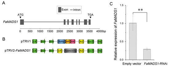 Construction of FaMADS1-RNAi strawberry fruit. Genomic DNA sequence analysis of FaMADS1 (A). Dark gray boxes represent exons and lines indicate introns. The scale indicates the length of the sequence. Schematic representation of the pTRV1 and pTRV2-FaMADS1 VIGS constructs (B). CP: viral coat protein; RdRp: RNA-dependent RNA polymerase; MP: movement protein; 16 K: 16 kDa protein; RZ: ribozyme. Relative FaMADS1 transcript levels in TRV (empty vector) and TRV-FaMADS1 (FaMADS1-RNAi) strawberry fruit were measured using qRT-PCR at 7 d after infiltration (C). Error bars represent standard deviation (SD, n = 3). Asterisks indicate values significantly different by Student’s t test from the control samples (** p < 0.01).