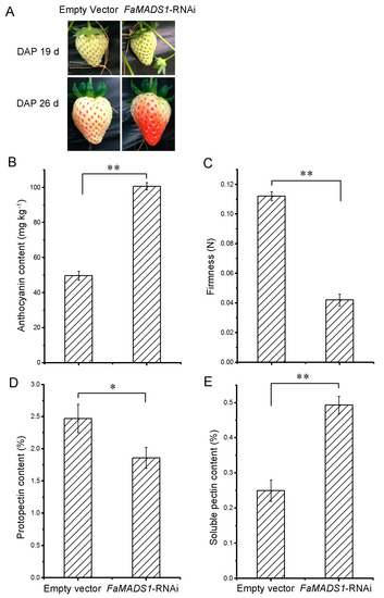 Fruit properties of FaMADS1-RNAi strawberry. RNAi fruit was already red when the control fruit was white at 7 d after injection (A). Anthocyanin content (B), firmness (C), protopectin (D), and soluble pectin content (E) were detected in control (empty vector) and FaMADS1-RNAi strawberry fruit at 7 d after injection. Error bars represent standard deviation (SD, n = 3). Asterisks indicate values significantly different by Student’s t test from the control samples (* p < 0.05; ** p < 0.01).