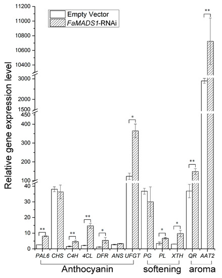 The expression of genes related to fruit color, firmness, and aroma metabolism was significantly regulated by FaMADS1-RNAi (Figure 5). FaMADS1-RNAi greatly promoted the expression levels of FaPAL6, FaC4H, Fa4CL, FaDFR, and FaUFGT, which are involved in anthocyanin biosynthesis [43]. FaMADS1-RNAi also induced the transcription of fruit softening-related genes, such as FaPL and FaXTH [44]. Notably, the expression level of FaQR in FaMADS1-RNAi fruit was 4-fold higher than the controls, and FaMADS1-RNAi led to an almost 3-fold increase in the expression level of FaAAT2.