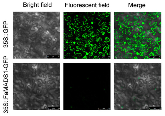 The open reading frame of FaMADS1 was cloned as C-terminal fusion in frame with the green fluorescent protein (GFP) gene into the pBI121 vector. The fusion construction and infection methods were performed according to Jia et al. [5] and Lu et al. [40]. The Agrobacterium suspension was evenly injected into the back of the leaf attached to the BY-2 tobacco (Nicotiana tabacum). After 48 h, at least six replicates of transfected leaves were analyzed using the laser scanning confocal imaging system (TCS SP8, Leica, Wetzlar, Germany).