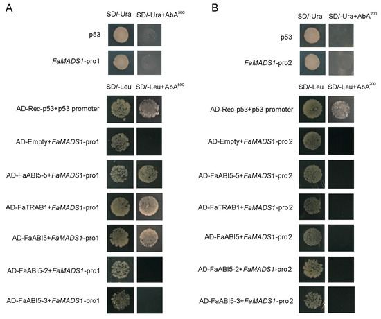 An online informatics survey was implemented to analyze a fragment of the FaMADS1 promoter sequence (1095 bp upstream from the ATG start codon). A putative domain (ABRE) for responding to ABA was found (Table S2). Therefore, two sequences (FaMADS1-pro1 and FaMADS1-pro2) of FaMADS1 promoter were cloned to study the interaction between FaMADS1 and ABA-related transcription factors (FaABI5-5, FaTRAB1, FaABI5, FaABI5-2, and FaABI5-3). FaABI5-5, FaTRAB1, and FaABI5 interacted with FaMADS1-pro1, whereas ABI5-2 and ABI5-3 did not interact with FaMADS1-pro1 (Figure 8A). FaABI5-5, FaTRAB1, FaABI5, FaABI5-2, and FaABI5-3 also did not interact with FaMADS1-pro2 (Figure 8B). These results revealed that FaMADS1-pro1 contained the active cis-acting elements, which could interact with FaABI5-5, FaTRAB1, and FaABI5.