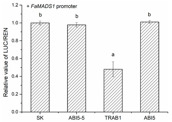 Regulatory effects of FaABI5-5, FaTRAB1, and FaABI5 on the promoters of the FaMADS1 gene using the dual-luciferase assay. The LUC/REN ratio of the empty vector (SK) plus promoter was set as 1. Different letters above the points indicate significantly different values (p < 0.05) through the LSD test.