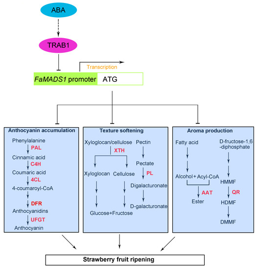 In conclusion, FaMADS1 expression negatively depended on ABA to regulate strawberry fruit ripening. The yeast one-hybrid analysis and dual-luciferase assay suggested that the FaMADS1 promoter was inhibited by the interaction with FaTRAB1, resulting in the blockage of FaMADS1 translation. ABA application and FaMADS1-RNAi data reflected a negative regulation of FaMADS1 to the downstream anthocyanin-related genes (PAL6, C4H, 4CL, DFR, and UFGT), softening-related genes (PL and XTH), and aroma-related genes (QR and AAT2), as well as the enzyme activities (Figure 10). This observation enhanced our understanding of the molecular mechanism of ABA signaling during the non-climacteric fruit ripening.
