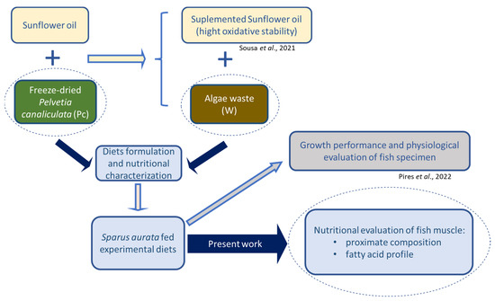 P. canaliculata was cleaned from extraneous matter, frozen at −80 °C, freeze-dried (Telstar, Lyoquest-85, Telstar Portugal, Lisbon, Portugal), ground to powder, and stored at room temperature, protected from light, until use. The alga was incorporated in diet formulations either as powder or as waste that was obtained after sunflower oil supplementation, as described by Sousa et al. [24]. Briefly, 12.5% (m/v) of freeze-dried P. canaliculata was added to sunflower oil and submitted to ultrasound-assisted extraction for 20 min. After, the mixture was filtered, and the solid residue (remaining algal biomass) was used as an ingredient for aquaculture feeds. A specialized company (SPAROS, Olhão, Portugal) formulated six isoproteic and isolipidic diets, using soybean oil in different proportions to adjust the fat content in the feeds. P. canaliculata was used either as freeze-dried powder, in concentrations of 1% (Pc1), 5% (Pc5), and 10% (Pc10), or as waste, in concentrations of 1% (W1) and 10% (W10). Additionally, a control diet (CT) without P. canaliculata was prepared. The description of all ingredients used in diet formulations was previously reported by Pires et al. [25]. Aiming at showing the overall work process in an integrative perspective, the experimental design is presented in Figure 1.
