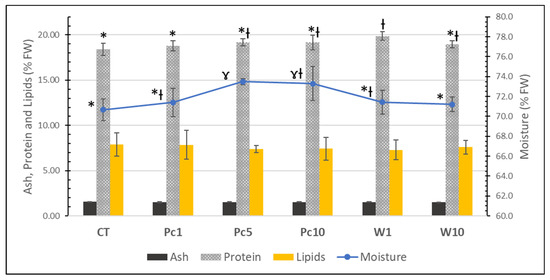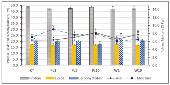 Proximate compositions of the muscle of S. aurata fed with the formulated diets: CT, Pc1, Pc5, Pc10, W1, and W10. For each parameter, a distinct symbol (asterisc and gamma symbols) means significative differences (p < 0.05) between samples.