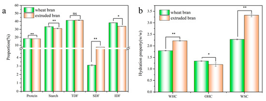 Figure 1. Contents of protein, starch, TDF, SDF and IDF of wheat bran (a); WHC, OHC and WSC value (b). Compared with raw bran, ns: no significant difference; *: significant difference (*: p ≤ 0.05; **: p ≤ 0.01).