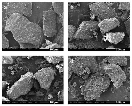 The microstructures of unextruded and extruded wheat bran are displayed in Figure 2. The structure of the raw sample was dense. The surface was smooth and had no obvious pores, factures or faults. After extrusion, the surface of bran became loose, porous and rough, with some small holes and obvious fragments or faults on it. During the extrusion process of wheat bran, based on the principle of gas phase change and thermal pressing effect, the high shearing action between screw and barrel as well as the heating action outside the sleeve jointly produced the internal pressure in the barrel. Under such conditions of high temperature, pressure and shear force, wheat bran changed from powdery or granular form to pasty form. In particular, starch was gelatinized and cracked, protein was denatured and recombined and fiber was partially degraded and refined, resulting in a melted state of the bran micro-surface [9,21]. Then, under the strong pressure difference, occurring at the outlet of the extruder, the moisture contained in the bran was instantaneously vaporized and flashed, so that the bran was expanded to form a loose and puffed structure. Other studies also confirmed that the extrusion process was prone to generate the above changes in microstructure and morphology of bran, which was beneficial to be hydrolyzed by enzymes [26]. Such micro-structural deformation should be attributed to the fast and full dissolution of SDF and good hydration features of bran.