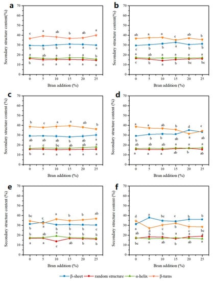 Figure 4. Protein secondary structure contents of wheat dough at high- (a,b), middle- (c,d), low- (e,f) gluten dough with raw (a,c,e) and extruded bran (b,d,f). Dots (mean ± SD, n = 3) with different letters have mean values that are significantly different (p < 0.05).