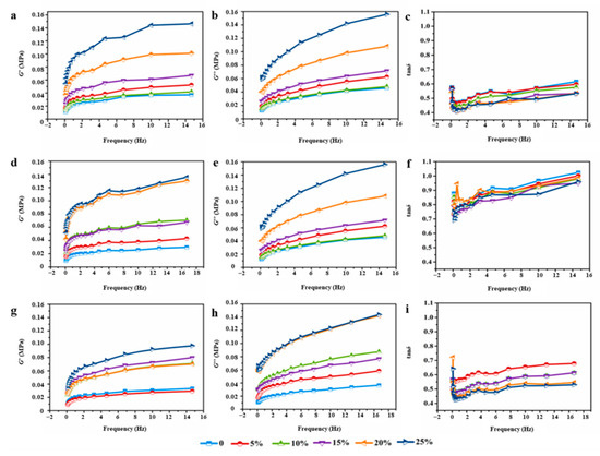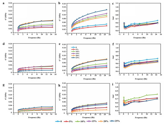 Figure 6. G′, G″ and tanδ of high-gluten (ac), middle-gluten (df) and low-gluten (gi) dough with extruded bran.