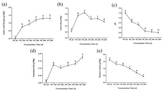 Changes of physicochemical indexes of kelp paste at different fermentation times: (a) changes of amino nitrogen, (b) changes of total acid, (c) changes of pH, (d) change of ammonium salt, (e) change of moisture content. Note: Statistically significant effects were assumed for p < 0.05. The following figure was the same. Note: Different lowercase letters represent significant differences between groups (p < 0.05).