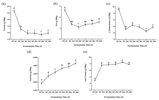 Changes in nutritional components of kelp paste at different fermentation times: (a) changes in protein, (b) changes in fat, (c) changes in carbohydrate, (d) changes in sodium, (e) changes in ash content. Note: Different lowercase letters represent significant differences between groups (p < 0.05).