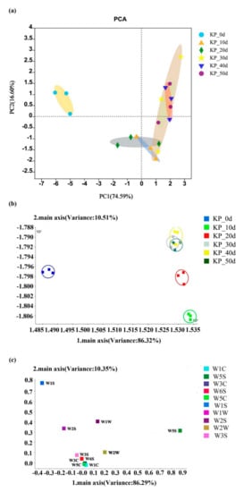 The odor information in the fermentation process of kelp paste was shown in Figure 3a. The contribution rates of the first principal component (PC1) and the second principal component (PC2) were 74.59% and 16.60%, respectively, and the total contribution rate was 91.19%, indicating that the extracted odor can reflect the information of different fermentation times of the kelp paste. During the whole fermentation process, the unfermented samples were concentrated in the second quadrant and the fermented samples were mostly concentrated in the first, third and fourth quadrants, with certain overlap, indicating that the kelp paste had certain similarities in odor during different fermentation times. At the same time, according to the analysis results in Table 3, the kelp paste had certain differences in odor during different fermentation times.