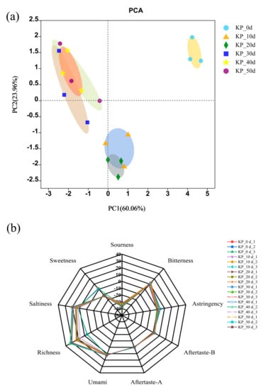 Electronic tongue analysis of kelp paste at different fermentation time: (a) PCA analysis, (b) radar analysis.