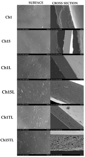 SEM micrograph of surface (×100) and cross-section (×500) of control films (Ch1 and Ch15); films with LEO (Ch1L and Ch15L); films with TLEO (Ch1TL and Ch15TL).