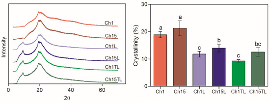 The X-ray diffraction patterns and relative crystallinity values of the films are shown in Figure 2. All samples showed peaks at around 9.8° and 20° 2θ (Figure 2), which were associated with the anhydrous crystalline (crystals forms I) and aqueous crystal character (crystals forms II), respectively [24]. It was observed that the intensity of the peak corresponding to crystal form I increased in the samples prepared with both EOs compared to the control samples (Ch1 and Ch15), which presented a higher intensity in the peak corresponding to crystal form II. The increase in the intensity of the type I peak in the samples prepared with EOs. This may be due to the separation and partial disorder of the chitosan chains due to the addition of some chemical groups that were present in the EOs. These results confirm those obtained for films prepared by chitosan and Perilla frutescens (L.) Britt. EO, in which an increase in the separation of chitosan chains could be observed with an increase in the concentration of EO added [25]. As a result of the loss of order in the chains and internal structures, a decrease in relative crystallinity could be observed. In this work, the addition of TLEO and LEO in chitosan films caused a decrease in crystallinity (Figure 2). This effect was more evident in the films prepared with the lowest chitosan concentration (1%), which could be associated with the lower ratio of chitosan: EO. The reduction in the relative crystallinity of the films can have an effect on the physical properties of the material, such as mechanical and barrier properties [19], due to the lower reorganization of the polymer chains [26].