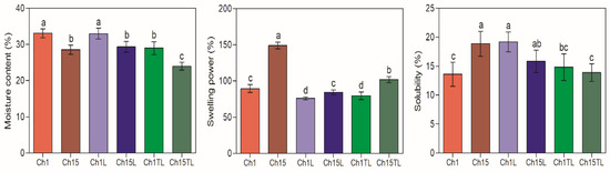Moisture content (% wet basis), swelling power (%), and solubility (%) of chitosan–essential oil films. Means and standard deviations. Different letters for the same characteristic indicate significant differences among the samples (p < 0.05).