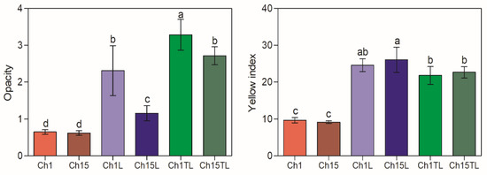 Optical properties such as OP and YI are helpful when evaluating packaging materials as they determine their potential use and consumer acceptability. It was observed that the addition of either of the two EOs significantly affected the optical properties of the films (Figure 4) (p < 0.05). Regarding opacity, the greatest increase in this parameter was observed in the Ch1TL sample, with an increase of more than 500% for the value observed by the control, followed by Ch15TL, Ch1L, and Ch15L, with gains of 439%, 357%, and 187%, respectively. The increase in opacity of these materials could be associated with a decrease in transparency due to the emulsion formation process causing a high turbidity blocking effect in the casting solution and, therefore, in the film [30]. This reduction in transparency with the addition of EOs has been previously reported for films prepared with chitosan and EOs of Carum copticum (340% opacity increase) [30], clove (119% opacity increase) [31], and rosemary (112% opacity increase) [27]. Although food packaging with low transparency can be associated with the presence of defects or with consumer rejection due to a negative evaluation of products, this type of packaging presents benefits such as barriers against UV-Vis light [31]. The packaging that offers this type of barrier represents an alternative that can be used in products susceptible to lipids and protein oxidation [32].
