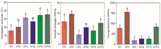 Elongation at break (%), tensile strength (MPa) and Young’s modulus (MPa) of chitosan–essential oil films. Means and standard deviations. Different letters for the same characteristic indicate significant differences among the samples (p < 0.05).