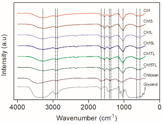 ATR-FTIR was used to evaluate the possible interaction between materials in the formulation of chitosan-based biodegradable films. Figure 6 shows the spectra obtained for the samples analyzed. All samples presented a broad band between 3000 and 3700 cm−1 (for films, the band is between 3000 cm−1 and 3600 cm−1), which is related to the stretching of intra and intermolecular hydroxyl groups (–O–H) and –CH2–OH stretching vibrations [30]. This band also can be related to the –N–H stretching mode of chitosan, indicating an overlapping of these two vibration modes [5]. The bands observed at 2930 and 2870 cm−1 could be assigned to C–H bonds’ asymmetric and symmetric stretching modes [29,35]. While the bands observed at 1640 cm−1 and 1555 cm−1 could be related to C=O stretching vibrations (amide I) and the N–H bending vibration mode (amide II), respectively. Absorption bands at 1405 cm−1 and 1374 cm−1 are related to C–N, N–H stretching modes, whereas bands at 1153 cm−1 and 1023 cm−1 correspond to the absorption of C–O–C groups [5,30]. The intermolecular interaction between chitosan and glycerol in the films can be evidenced because the inclusion of the latter generated the intensification of absorption bands in the range of 600–750 cm−1 corresponding to the bending vibration of hydroxyl groups. In addition, it produces a sharpening of the band, which can be related to the stretching vibration of the OH group (3000 cm−1 to 3700 cm−1) and a shift in the band corresponding to the C–O stretching vibration from 1083 cm−1 in pure chitosan to 1023 cm−1 in the samples evaluated. These observations agree with the report for chitosan films and the inclusion of Carum copticum EO [30]. The same authors also reported that the shift in the NH bending absorption peak of pure chitosan (1670 cm−1) toward a shorter wavelength in the films might be due to the interaction between chitosan and EO, which could be observed in the films, including LEO and TLEO. The latter also confirmed what was observed in chitosan films, including Ruta graveolens EO [37].