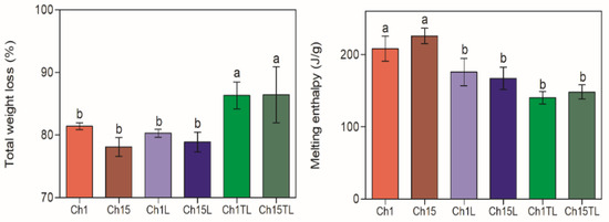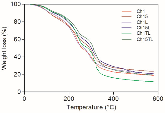 The weight loss curves of chitosan–EO films are shown in Figure 7, and the total weight loss calculated from these curves is represented in Figure 8. The total weight loss due to thermal decomposition for the analyzed samples was from 78.1% to 86.3% (Figure 8). The decomposition took place in three stages for the control films (Ch1 and Ch15), which could be associated with the evaporation of absorbed water and residual acetic acid (49–116 °C) [30], the decomposition of glycerol (166–246 °C) [5], and the depolymerization of chitosan structures with the decomposition of functional groups such as hydroxyl and amine groups [22,33]. A significant increase in the total degradation was observed only in samples of TLEO inclusion (Ch1TL and Ch15TL) (p < 0.05). However, the inclusion of LEO did not significantly affect the total decomposition of films Ch1L and Ch15L.
