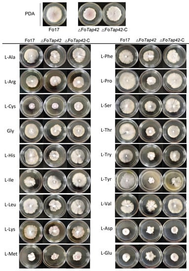 Colony morphology of wild-type F. oxysporum Fo17, ΔFoTap42 and ΔFoTap42-C in dextrose agar medium, supplemented with 18 amino acids cultured for 7 d at 28 °C (n = 3). Control was cultured in the PDA medium.