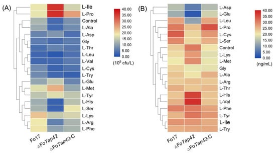As shown in Figure 2, heat map analysis showed the effect patterns of AAs on sporulation and T-2 production by Fo17, ΔFoTap42 and ΔFoTap42-C. During sporulation, L-Ile and L-Pro groups clustered closely together, showing significantly activated (p < 0.05) spore production of ΔFoTap42, but a reduction in ΔFoTap42-C, which indicates that Tap42 negatively regulated L-Ile and L-Pro absorption and, thereby, affected the F. oxysporum spore formation. In contrast, in the L-His and L-Ser groups, the spore production of ΔFoTap42 was lower than in Fo17 and ΔFoTap42-C, meaning that Tap42 positively activated L-His and L-Ser absorption in F. oxysporum. When a lack of a regulated gene markedly reduces spore production, it indicates a decrease in reproductive dispersal capacity. The L-Ala group clustered with the control group means that L-Ala addition did not significantly affect the spore production of Fo17, ΔFoTap42 or ΔFoTap42-C (Figure 2A). L-Asp and L-Glu addition inhibited T-2 production by Fo17, and a lack of Tap42 significantly inhibited the T-2 production (<20 ng/mL). This is because acidic AAs negatively regulated the pathogenicity of Fusarium spp.. The L-His, L-Val, L-Lys and L-Met groups clustered together, and the T-2 production was significantly increased when Tap42 was lacking (Figure 2B).