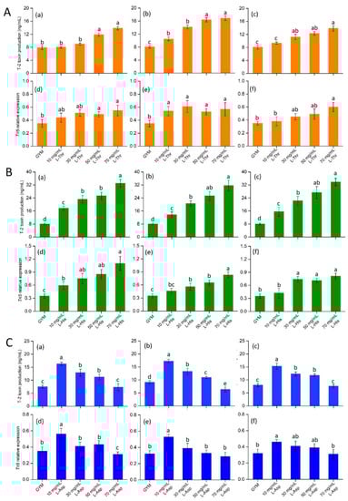 Effects of L-Threonine (L-Thr) (A), L-Histidine (L-His) (B) and L-Aspartic acid (L-Asp) (C) on T-2 toxin production and Tri5 expression of different strains (n = 3), cultured at 28 °C for 14 d. The control was cultured in GYM medium. (a)–(c): T-2 toxin production of wild-type Fo17, ΔFoTap42 and ΔFoTap42-C; (d)–(f): Tri5 expression of wild-type Fo17, ΔFoTap42 and ΔFoTap42-C. Different letters “a–d” in the same plot indicate significant differences (p < 0.05).