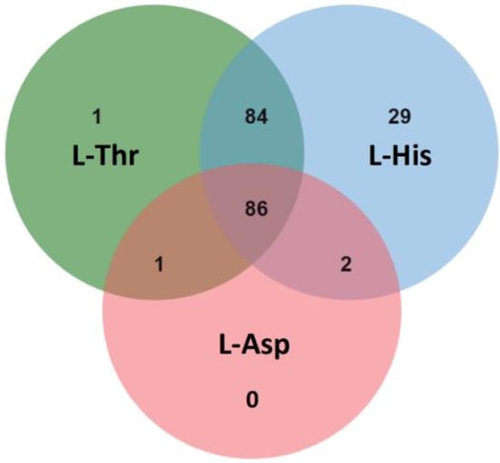The common and specific numbers of potential Tap42-interacting proteins in F. oxysporum following L-threonine (L-Thr), L-Histidine (L-His) and L-Aspartic acid (L-Asp) treatments (n = 3).