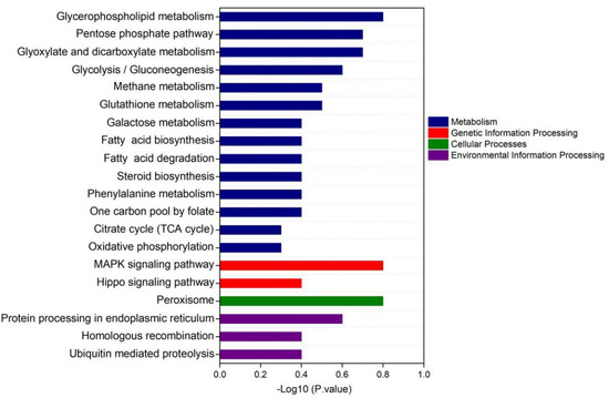According to KEGG enrichment analysis, Tap42-interacting proteins were mostly derived from metabolism, genetic information processing, cellular processes and environmental information processing. Most of the interacting proteins came from the metabolic pathways, mainly from glycerophospholipid metabolism, pentose phosphate pathway, glyoxylate and dicarboxylate metabolism, glycolysis, gluconeogenesis, methane metabolism and glutathione metabolism. The related secondary metabolic pathways were galactose metabolism, fatty acid biosynthesis, fatty acid degradation, steroid biosynthesis, phenylalanine metabolism, one carbon pool by folate, citrate cycle, TCA cycle and oxidative phosphorylation (Figure 6).
