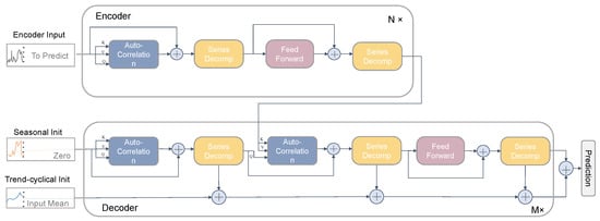 Autoformer’s core auto-correlation mechanism, which is key to discovering period-based dependencies by calculating sequence auto-correlation coefficients, consists of period-based dependencies and time-delay aggregation. Figure 2 shows a schematic diagram of the internal structure of the auto-correlation module.