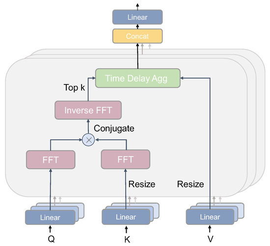 The dependence of the period in the auto-correlation mechanism is found from the efficient computation of the auto-correlation coefficients, as shown in Figure 2, by mapping the inputs to obtain Q, K, and V. Based on the Winer–Khinchin theory [39], a Fast Fourier Transforms (FFT) operation is performed on Q and K, respectively, and a conjugate operation is also added to K. Finally, the original correlation coefficient of the sequence and the lag sequence must be computed to find the periodically similar subsequence. The specific formula is as follows.