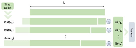 Next, time-delay aggregation of auto-correlation first aligns the subsequences with the same phase based on the estimated cycle length using the () operation, converts them into probabilities by the softmax normalization operation, and finally aggregates the information by fusion. The () operation moves V into the same phase, as shown in Figure 3.