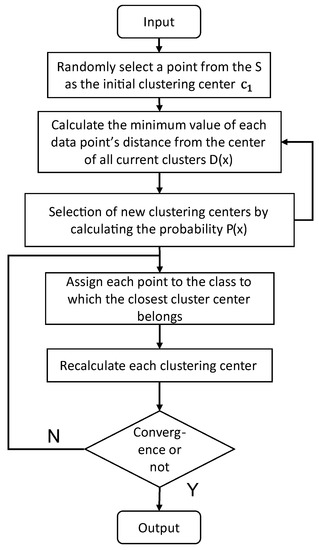 Given dataset S with N data points, let k be the desired number of clusters. The algorithm outputs a set of k centroids {, , …, } that minimize the within-cluster sum of squares. The standard algorithm form of the K-means++ algorithm is shown below. Furthermore, the detailed algorithm flow is shown in Figure 4.