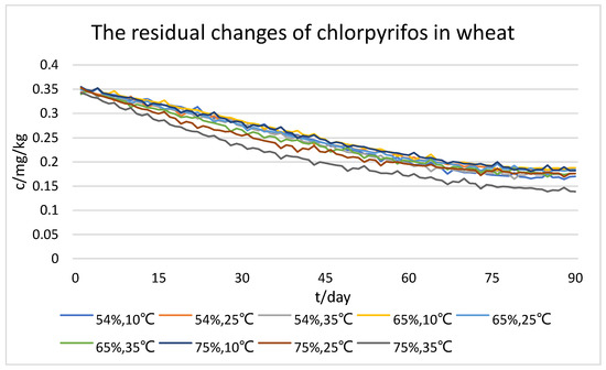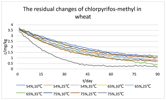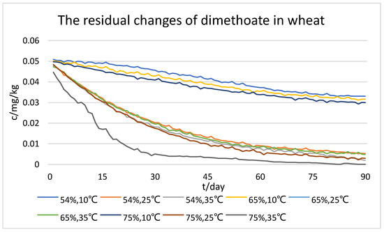 As shown in the figures, we can initially see that all three types of pesticide residue in wheat gradually degraded with time. The higher the temperature, the faster the concentration of pesticide residues decreased under the same storage humidity; also, the higher the humidity, the faster the concentration of pesticide residues decreased under the same storage temperature. However, comprehensively comparing the three types of pesticide residue, the degradation rates of dimethoate and chlorpyrifos-methyl were the fastest and the most affected by temperature; humidity had a facilitating effect on the degradation rate of two pesticides, but the effect was not significant enough. In addition, the degradation rate of chlorpyrifos was less affected by both temperature and humidity. From the results of the dataset, it can be seen that the optimum storage humidity for pesticide residue degradation is 75%, and the optimum temperature is 35 °C.