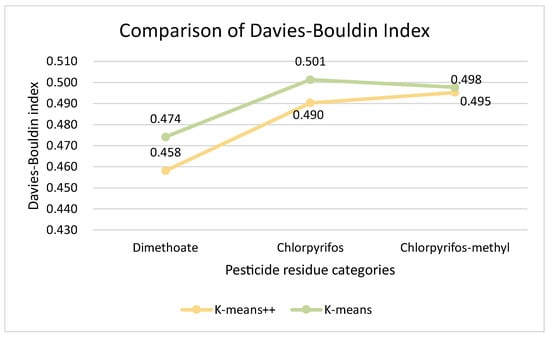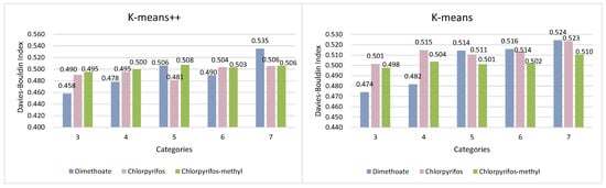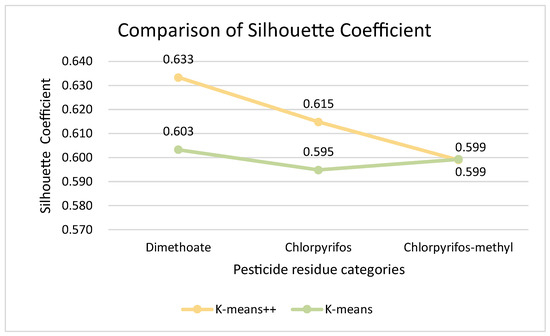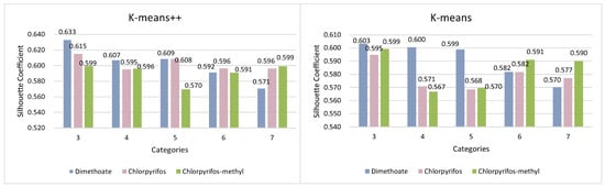 According to the results of the prediction of pesticide residue changes based on Autoformer, for further work on wheat quality assessment, the daily evaluation index Q values of individual samples of wheat were used as the clustering feature input to the model. While applying the K-means++ and conventional K-means algorithms for wheat quality assessment of three pesticide residues in wheat storage grains, in order for the experiments to be more useful, two clustering evaluation indexes SC and DBI were used in this paper to evaluate their clustering results reasonably, while conducting experiments. The findings are presented in Figure 8 and Figure 9.