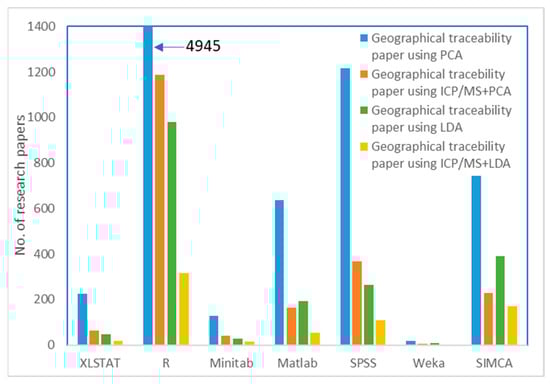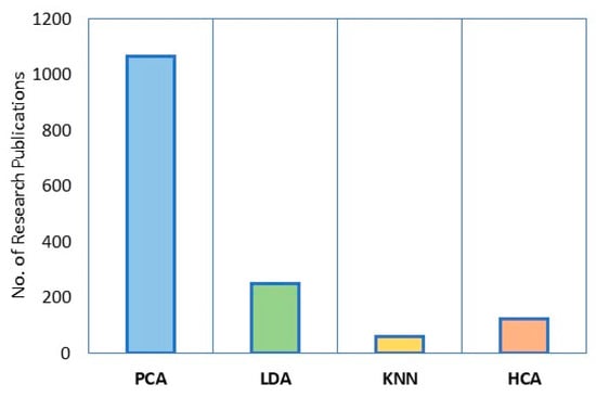Figure 1 shows the different number of research publications using PCA, LDA, K-nearest neighbor (KNN), and HCA multivariate statistical methods for geographical origin determination. PCA is a popular technique used in determining the geographical origin of agricultural products because it can reduce dimensionality by using main principal components (PCs) to express the information spread across numerous columns, wherein the first few PCs can account for an important proportion of the total variance. These PCs are then used as explicable variables in machine-learning models. In addition, datasets with more than three features or dimensions can be difficult in class visualization. It can be observed that a clear distinction between clusters or classes relies on the first two PCs, which allows for a simple and more effective visualization of the data [81].