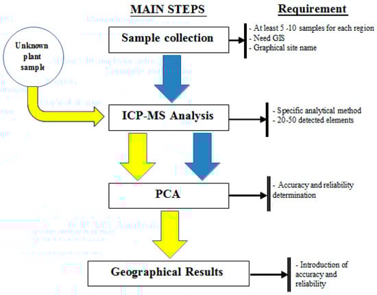 Generally, trace elements represent the geographical tracer in a specific soil condition, and are absorbed via the roots and transferred to various parts of the plant. The distribution of trace elements reflects the elemental signature of the soil origin. In addition, the isotope ratios of the elements show the linkage between products and soil characteristics. Particularly, isotopes of heavy metals have been considered the most suitable for tracing a plant-based food’s origin. However, the isotopes of light elements such as hydrogen, nitrogen, oxygen, and sulfur are considered reliable indicators of food authentication, but the ratio of these elements is too variable to serve as tracers of the soil where a product is produced [74,75,76].