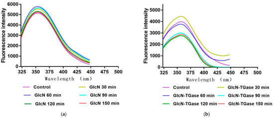 Effects of different treatments on fluorescence intensity of Lentinus edodes protein fraction. Note: (a) fluorescence intensity of Lentinus edodes protein fraction treated with GlcN; (b) fluorescence intensity of Lentinus edodes protein fraction treated with GlcN-TGase.
