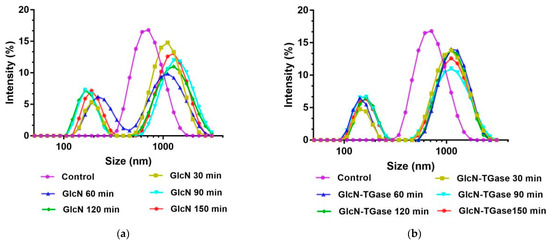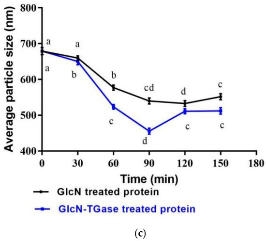 The particle size of the protein may affect the formation and stability of aggregates in protein solutions, thereby affecting the functional properties of proteins [40]. The control protein had only one single peak and the distribution was relatively uniform (Figure 2a). However, the glycosylated protein had two peaks, which was due to the glycosylation reaction between sugar and the protein to produce glycoprotein compounds, causing the structure of the protein molecules to curl and changing their dispersion [41]. With an extension in the time, the large particles gradually increased, indicating that the degree of glycosylation becomes higher and higher and the protein conformation changes with the introduction of monosaccharide molecules, and also indicating that the particle size will increase [42]. The particle size of the protein treated with enzymatic glycosylation showed a similar trend to that of glycosylation (Figure 2b), which was distributed around 1000 nm and 200 nm. This indicates that the reaction between TGase and GlcN makes the product more evenly distributed. These phenomena indicate that TGase catalyzes protein glycosylation and the cross-linking reaction to increase the size of protein aggregates, which agrees with a previously published report [43].