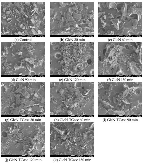At the beginning, the TGase-catalyzed glycosylated proteins showed a compact texture structure like with the glycosylated proteins, indicating that they formed a stable three-dimensional network structure (Figure 3g,k). With an extension in the time, the flaky structure of proteins became more and more obvious, which may be due to the mutual promotion of the TGase and glycosylation reaction, weakening the structure of protein and making the protein flaky. Thus, TGase promotes GlcN to enter the Lentinus edodes protein fraction and reduces the average particle size. However, the TGase-catalyzed glycosylated protein was smaller and less rigid compared with the untreated Lentinus edodes protein fraction and GlcN-treated Lentinus edodes protein fraction. Therefore, TGase can promote the combination of GlcN and Lentinus edodes protein fraction to decrease the particle size and significantly enhance the protein’s flexibility [45].