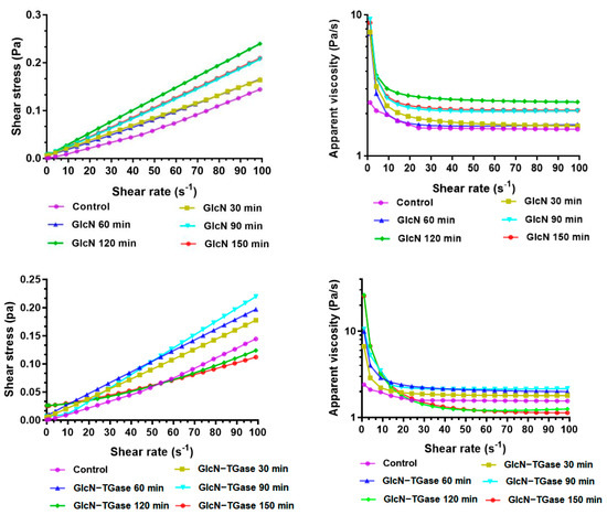 The apparent viscosity of the TGase-catalyzed glycosylated Lentinus edodes protein fraction decreased with an increase in shear rate. At a certain shear rate, when the treatment time was within 90 min, the apparent viscosity of the protein fraction treated with enzymatic glycosylation was significantly elevated compared with the control and the glycosylated protein. This is because the glycosylation reaction catalyzed by the TGase covalently combines protein with glucose, increasing the interaction between proteins in the reaction system and thus increasing the apparent viscosity [7]. However, when the treatment time reached 120 min, the apparent viscosity was lower than that of the control protein, which may be due to the degradation of the polymers or the formation of steric hindrance, owing to the excessive reaction time. It can also be seen from the microstructure that the treatment for 120 min makes the protein flake, which reduces the apparent viscosity.